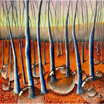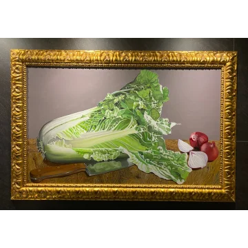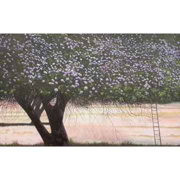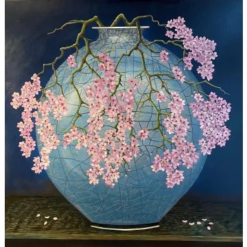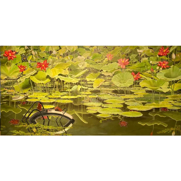 This oilpainting on linnen juxtaposes the serene beauty of blooming water lillies and lush lotus leaves with the stark intrusion of a discarded bicycle. The piece serves as a poignant commentary on how some treat nature-with disregard and carelessnes. The detailed rendering of the natural elements contrasts with the human-made object, creating a narrative about the fragility of our environment and the impact of human actions ,